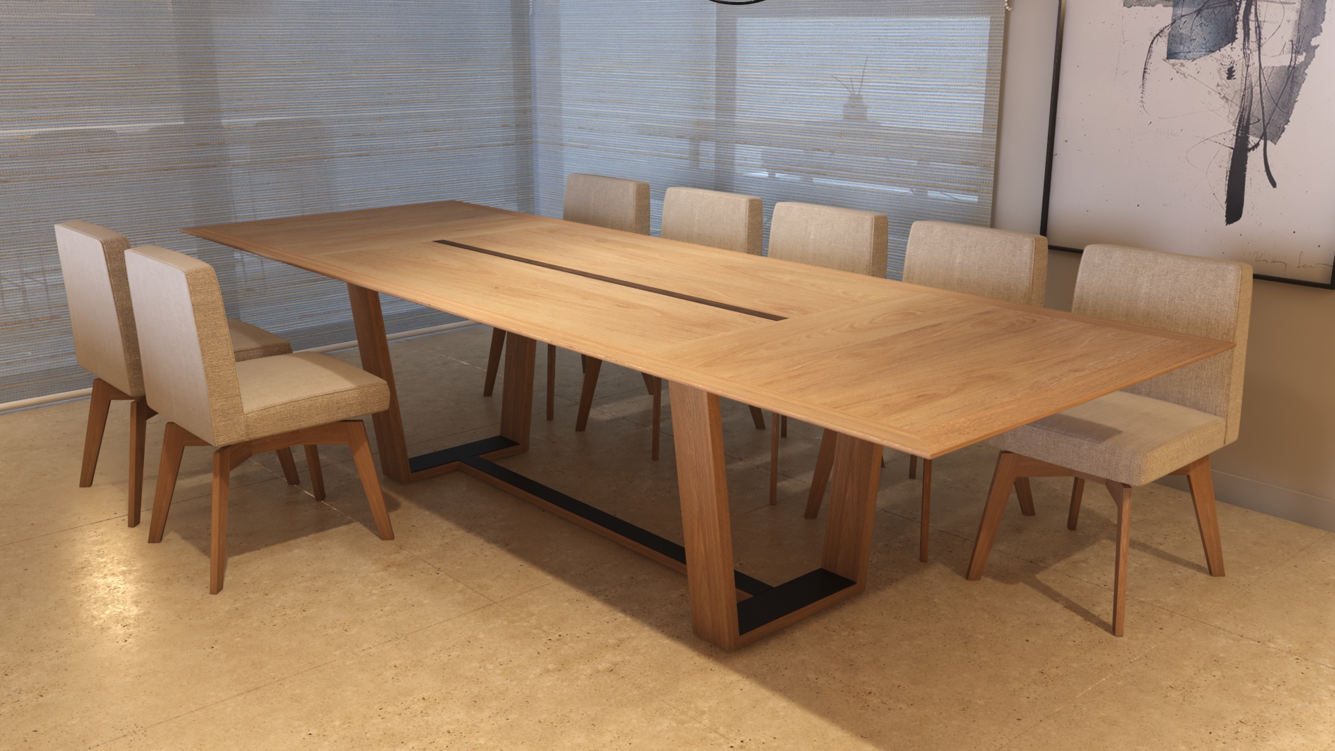 La base es una cruceta invertida totalmente formada en ángulos en formato trapezoidal , otorgándole a la mesa una sofisticación y elegancia importante . La tapa se encuentra separada de la base por terminales metálicos ( en diferentes acabados : aluminio, acero pulido, cromado, pintura al horno negra , blanco u oro ). La tapa puede ser totalmente de madera con el canto a 45º o con una sobre tapa de mármol, cristal 15mm o Neolith o en madera con la veta en SOL .